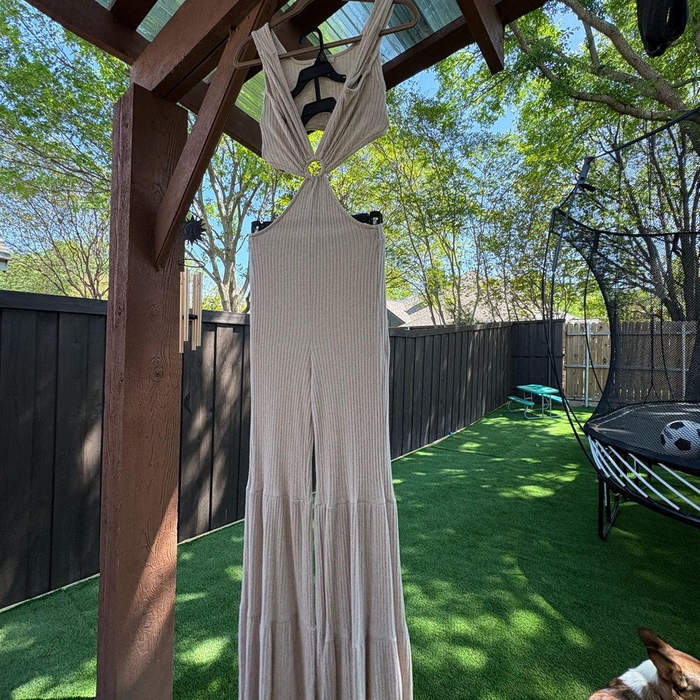 Stylish cream ribbed jumpsuit with a halter neck design. Perfect for casual outings.