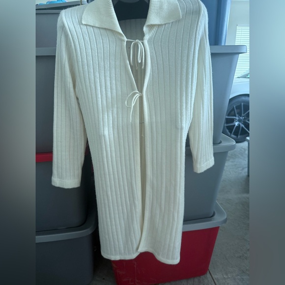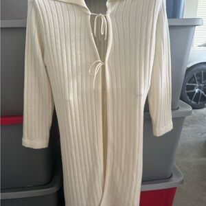 Stylish cream ribbed knit cardigan with tie closure. Perfect for layering.