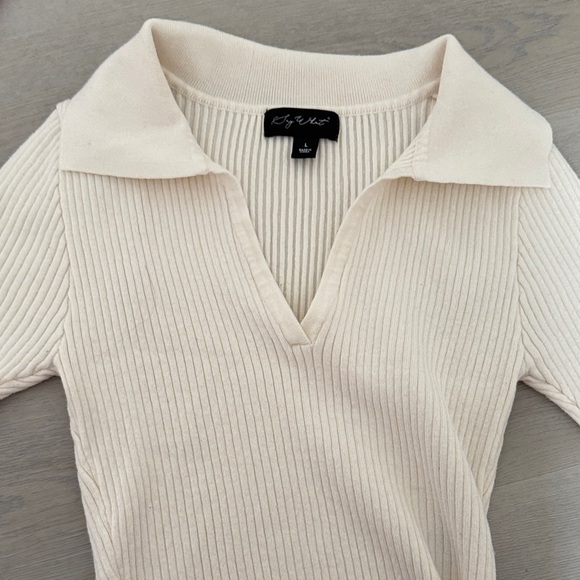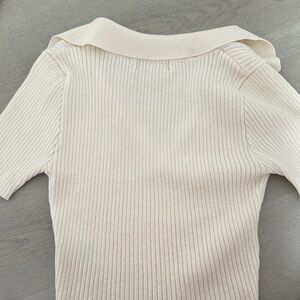 White cropped collared short-sleeve top in perfect condition. Features a fold-over collar with a flattering V-neckline and a ribbed, textured fabric with subtle vertical lines. The fit is cropped and hits around the belly-button for a trendy, flattering look. No flaws or signs of wear.Label says large, but it’s actually closer to a medium/small.