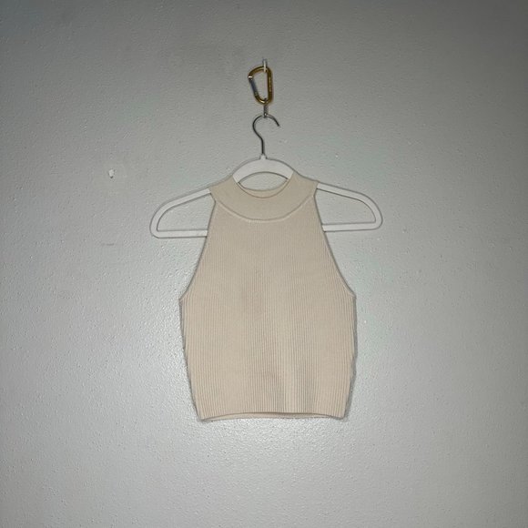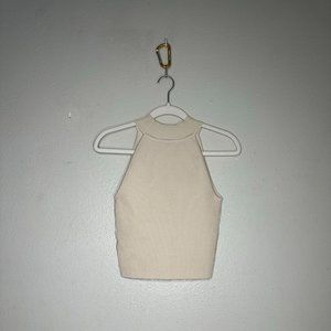 Cream Ribbed Knit Criss Cross Halter Neck Tank Top