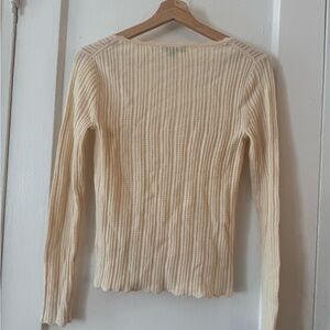 Stylish cream ribbed knit sweater with a square scalloped neckline.