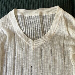 Stylish cream ribbed knit sweater with a V-neck design. Perfect for layering.