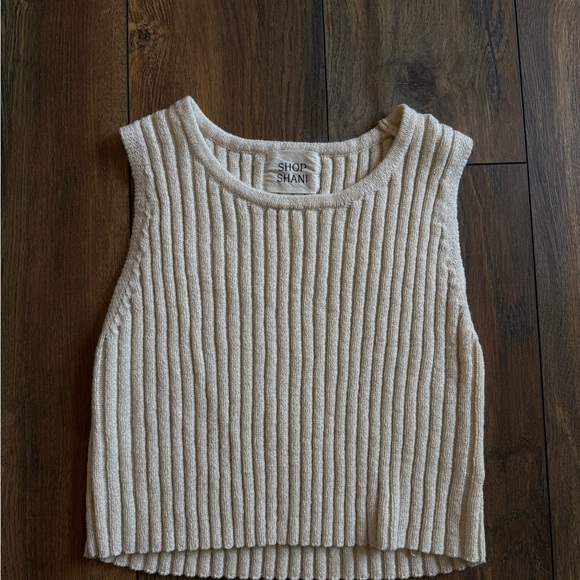 cream ribbed knit tank top with a flattering cropped silhouette. Soft, textured fabric offers comfortable everyday wear. Versatile cream color pairs easily with jeans or skirts.