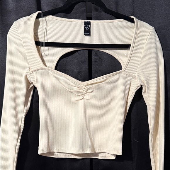 Elevate your style with the Cream Ribbed Long Sleeve Top. This chic top features a unique ruching to flatter the chest and a sexy cut-out design in the back, perfect for any occasion and winter layering. Fits small/xs worn once unfortunately no longer fits.