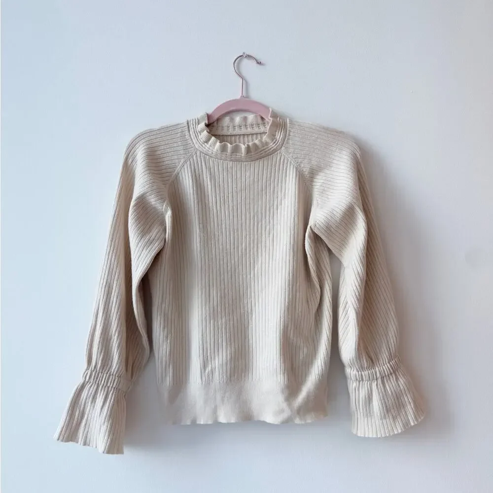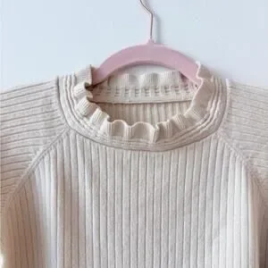 Elegant cream ribbed sweater featuring ruffle details on the collar and cuffs. Perfect for a chic and cozy look.