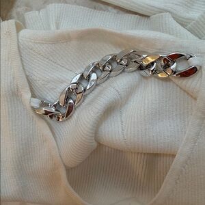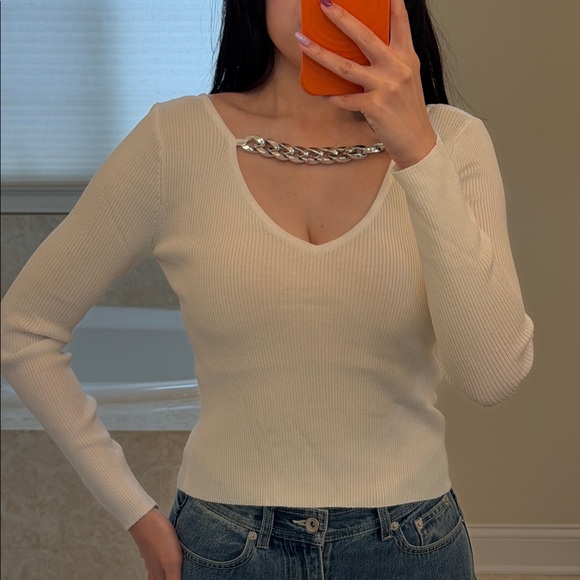 Stylish cream ribbed sweater featuring a silver chain detail at the neckline. Perfect for a chic look.