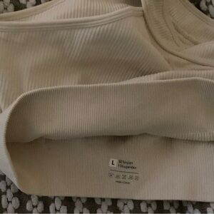 Cream ribbed one shoulder tank top. Item can be perfect for layering or wearing alone.