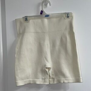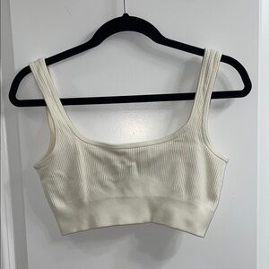 Stylish cream ribbed two-piece workout set. Includes a sports bra and biker shorts.