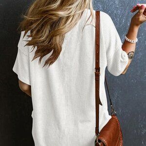 Soft ribbed short sleeve tee in a creamy off-white color with a flattering V-neckline and front chest pocket. Comfortable stretch with a relaxed fit, making it an easy everyday top for casual wear or layering.