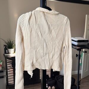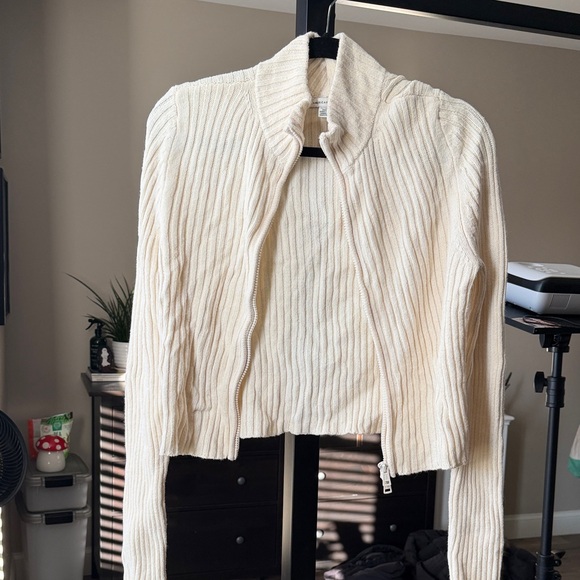 Stay cozy and stylish with this cream ribbed zip-up sweater. Perfect for layering, this top offers both comfort and elegance.
