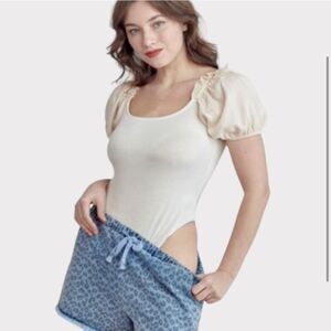Very soft cream color ribbed bodysuit. The sleeves is a linen-like material and is poofy. There are small ruffles that border the top of the sleeves.