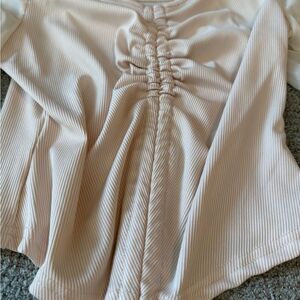 This elegant cream top features a stylish ruched front and sheer long sleeves, perfect for any occasion. women size Medium. Puff sleeve