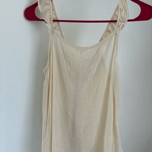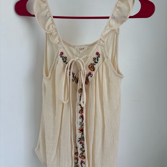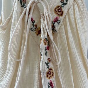 Chic cream blouse with colorful floral embroidery. Features a tie-front detail and ruffled straps. Ideal for stylish outings.
