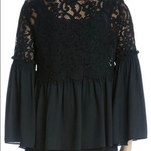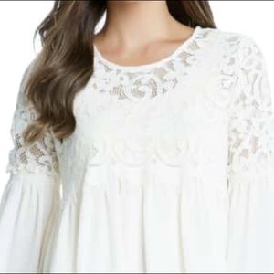 Ruffle Hem Lace Top in cream. Bell sleeves. Lace upper. Supper flirt. Pair with skinnies. Purchased from Nordstrom.