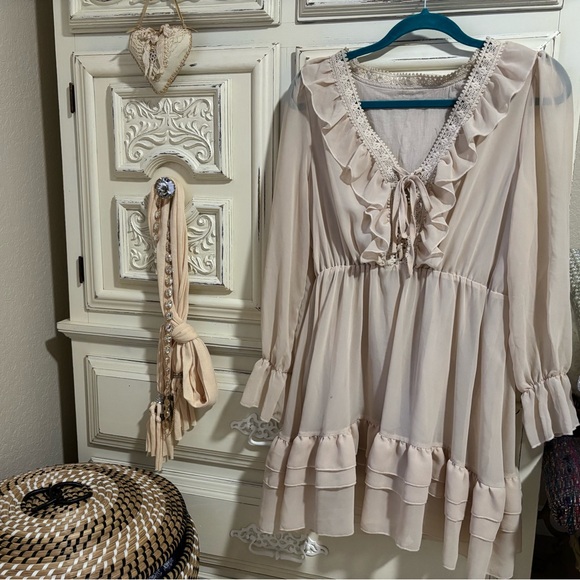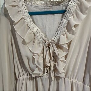 Elegant mini dress with ruffle details. Features a tie-front neckline with lace trim. Perfect for casual outings and would look great with boots. Double layered with sheer fabric on top. Never worn and no obvious damages or stains.