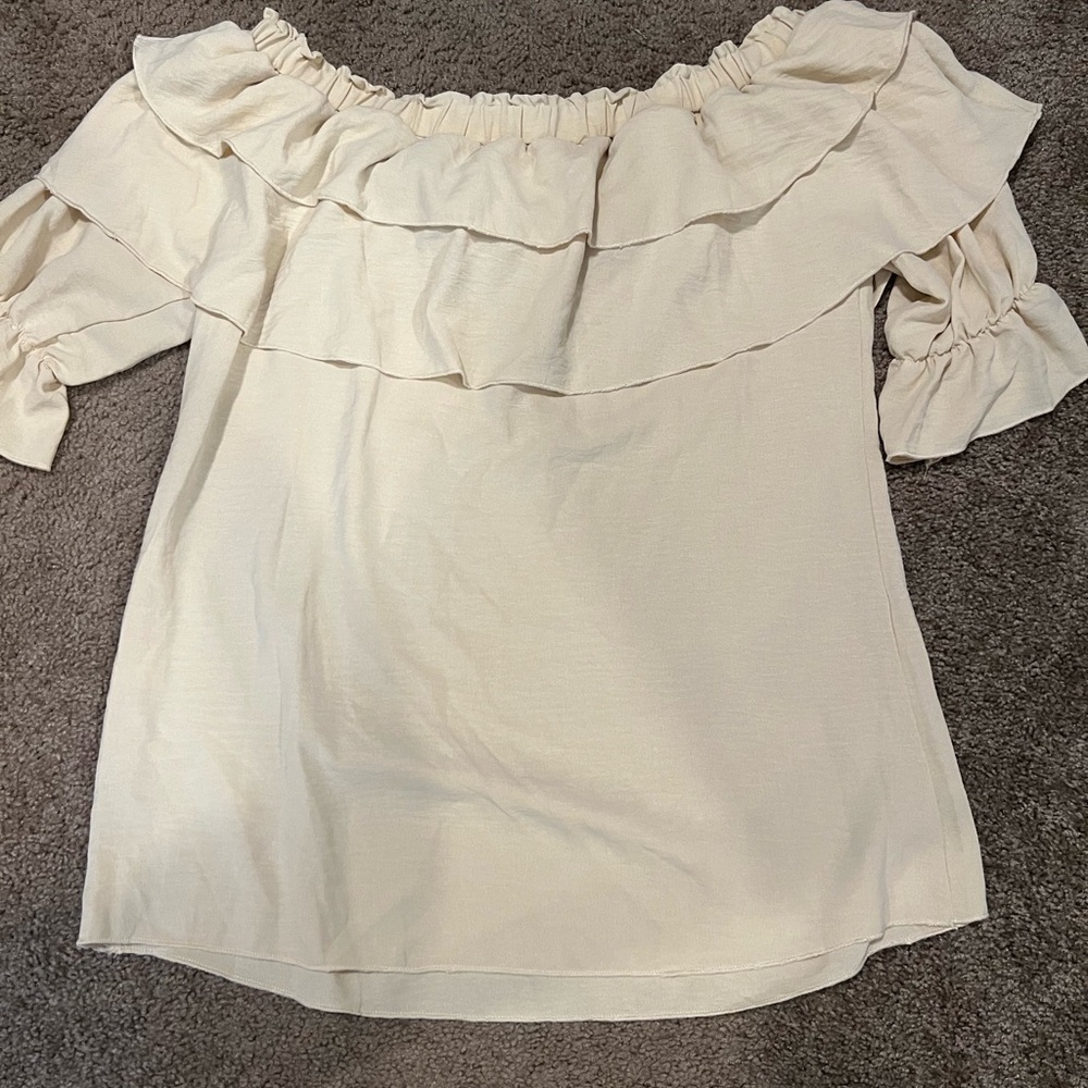Chic off-shoulder blouse with ruffle detail. Soft cream color. Ideal for versatile styling. Small spot on sleeve