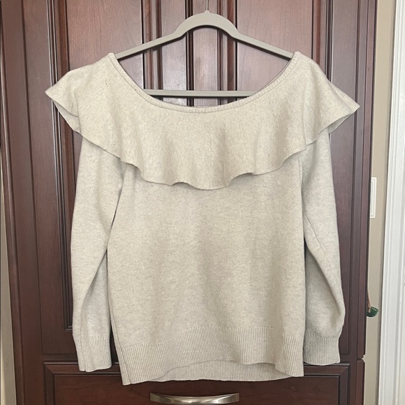 Banana republic cream sweater features a stylish ruffle design, perfect for adding a touch of sophistication to your wardrobe. Ideal for any occasion, it combines comfort with chic style.. It could be worn off on the shoulders.. It has only been worn once or twice. Very comfy..