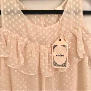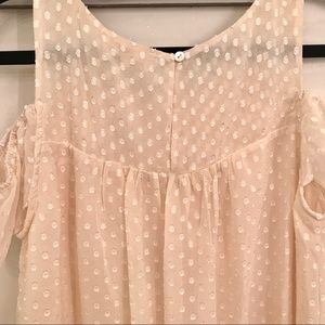 Cream, cold shoulder top. Ruffle detail and polka dot texture. Lined. Key hole button closure in back.