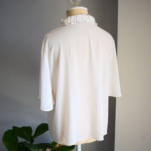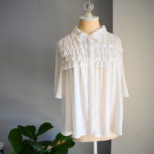 Cream short sleeve button down top with bell sleeve and ruffle/ruching on top part of blouse.