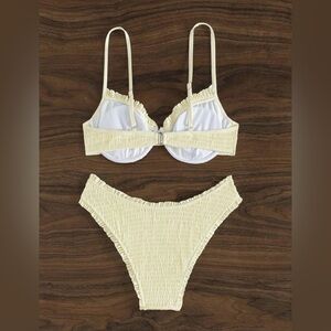 Stylish cream bikini set with ruffled details. Perfect for beach days.