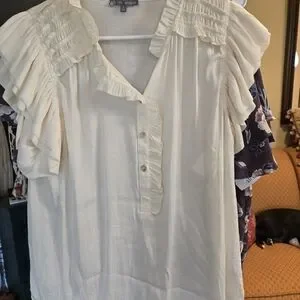 Stylish cream blouse with elegant ruffles, perfect for any occasion.