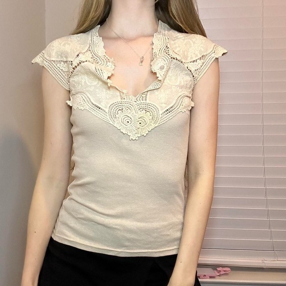 This cream blouse showcases a sophisticated ruffled design with cap sleeves, offering a fitted silhouette that enhances your style. The intricate lace detailing around the neckline adds a touch of elegance, making it a versatile choice for any occasion.