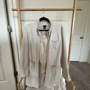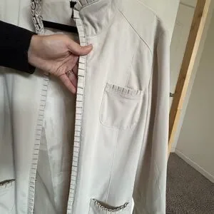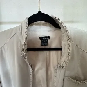 Stylish cream jacket with ruffled edges. Features front pockets and a sleek design.