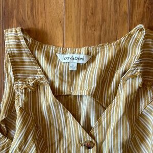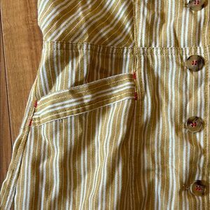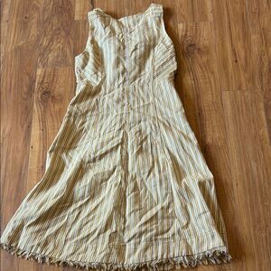 A sleeveless sundress in a light cream color with a delicate ruffle detail at the hem, falling around knee-length.