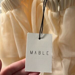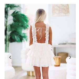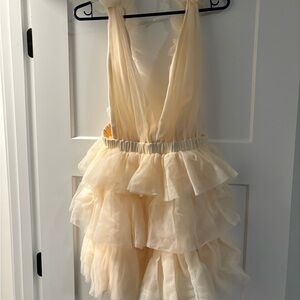 Elegant cream mini dress. Features layered ruffles and a deep V-neck. Perfect for special occasions.