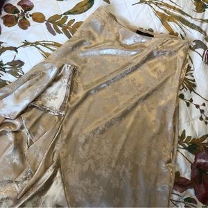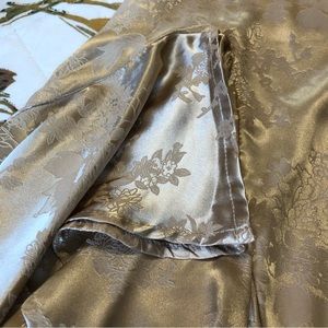Lightweight skirt with floral detailing. The color is a cream muted gold. The skirt has a Spanish look to it. A zipper is located at the waist for ease of getting on and off. It’s great for dancing and dressing up. The slit comes up to a high point. It’s sexy but classy.