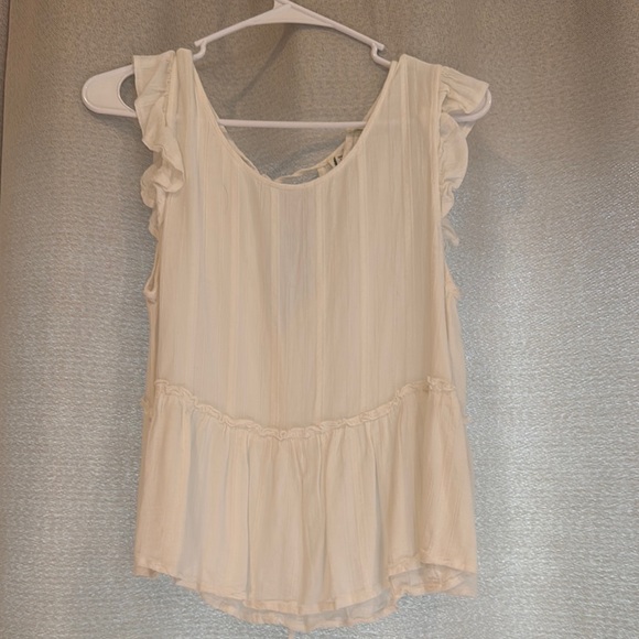 Elegant cream sleeveless top with delicate ruffles. Perfect for a chic and stylish look.