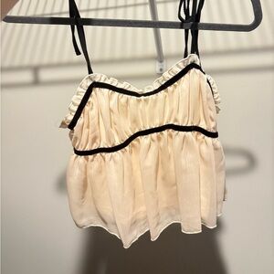 Chic cream sleeveless top with ruffled details and black trim.