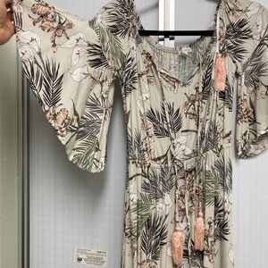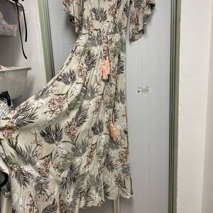 This cream maxi dress features a ruffled wrap design with flutter sleeves and a scoop neckline, perfect for resort wear. The flowing silhouette and light fabric make it ideal for casual outings, offering both comfort and style.