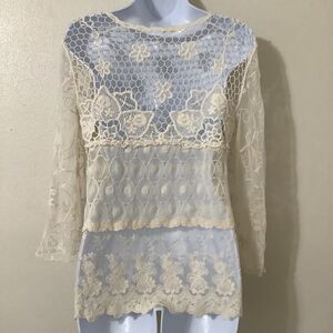 Cream Sheer Lace Crochet Fairycore Fairy Bohemian Hippie Boho Lagenlook Top M