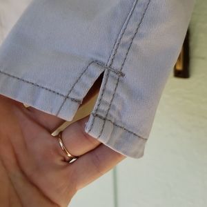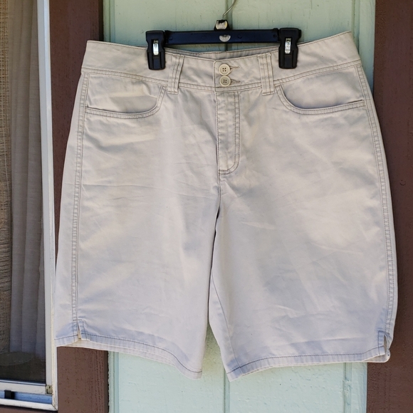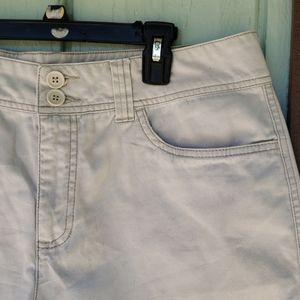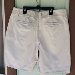 Full size, slotted back pockets add style to these lightly worn shorts.