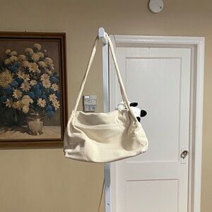 Stylish cream shoulder bag featuring a playful bread design. Perfect for casual outings.