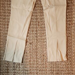 These cream skinny pants offer a sleek and tailored fit, perfect for a polished look. Made from a structured fabric, they provide a smooth and uniform texture throughout. Ideal for both casual and formal occasions, these pants are a versatile addition to any wardrobe.