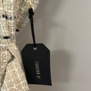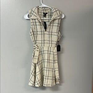 This cream mini sundress features a notched collar and a tie front, perfect for casual or work settings. Its sleeveless design and buttoned front add a touch of elegance to its relaxed style.