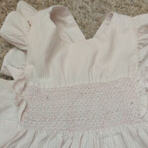 This casual sundress in a soft cream color showcases a smocked bodice and charming ruffled details. The sleeveless design with flutter sleeves and a scoop neck provides a breezy elegance, perfect for warm weather. Its lightweight fabric ensures comfort and style for any casual outing.