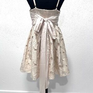 This new cream sundress is perfect for a wedding guest or cocktail event, featuring a sleeveless design with delicate spaghetti straps. The dress showcases a charming bow detail at the waist, adding a touch of elegance to its flowy A-line silhouette.