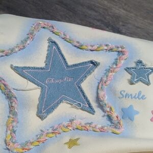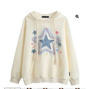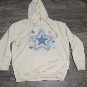 Cream hoodie with a colorful star patch design. Features a drawstring hood.