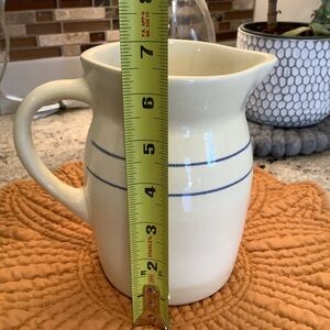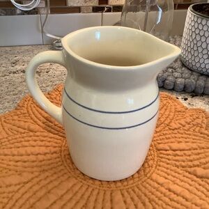 Elegant cream pitcher featuring subtle blue stripes. Perfect for serving beverages or as a decorative piece.