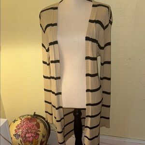 This Doe & Rae cardigan showcases a classic cream and black stripe pattern, offering a timeless and versatile look. Crafted from a soft knit material, it features a relaxed fit and long sleeves, making it perfect for layering in any season. NWOT.