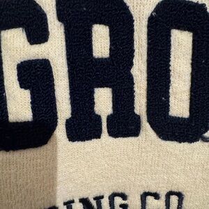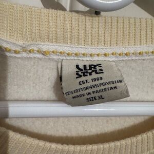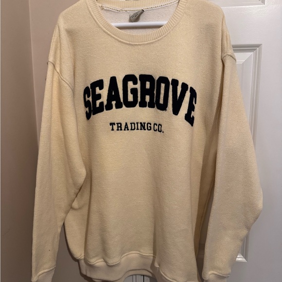 Stay cozy and stylish with this light yellow and navy sweatshirt. Perfect for any casual outing. 30A Seagrove Beach Florida.