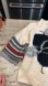 Stylish cream sweater featuring a bold black floral design. Accented with gray and red stripes on the sleeves.