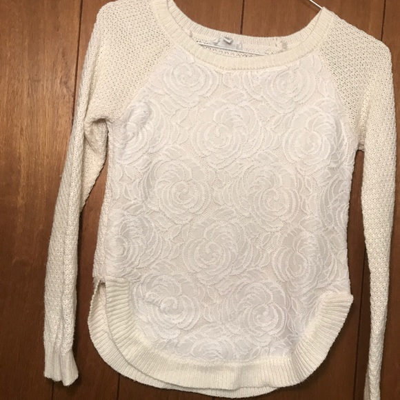 Cream colored sweater with Lace panel on front. Soooo soft and cute. Has hip showing cut on bottom sides.