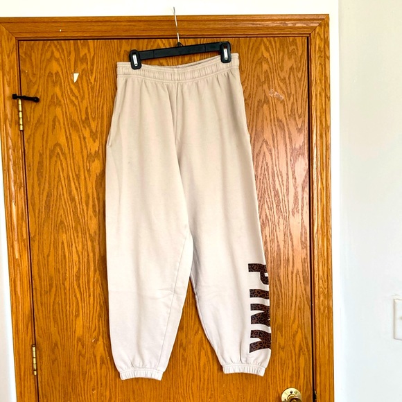 Comfortable cream sweatpants featuring bold leopard lettering on the leg.