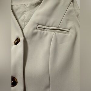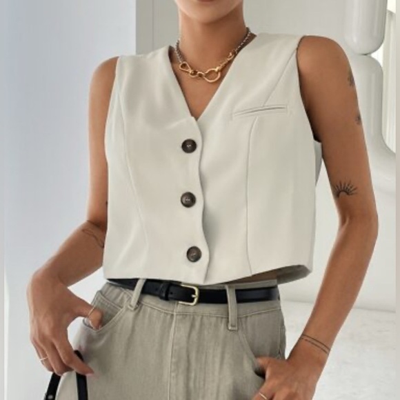 This cream vest features a structured, tailored fit with a V-neckline and a cropped length that hits at the waist. Its clean, minimal design is crafted from a textured linen or cotton-blend fabric, offering a modern and sophisticated look.