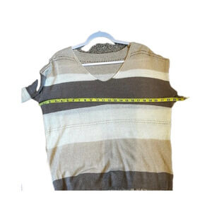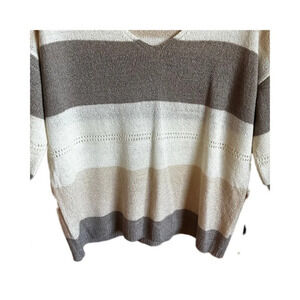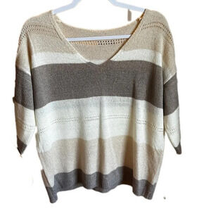 Cream/ Tan Striped Large V-neck 3/4 length Sleeve Sweater