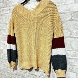 Comfy Cream - Tan-colored sweater with a color block pattern on the sleeves with maroon, gray and white! Gently worn!